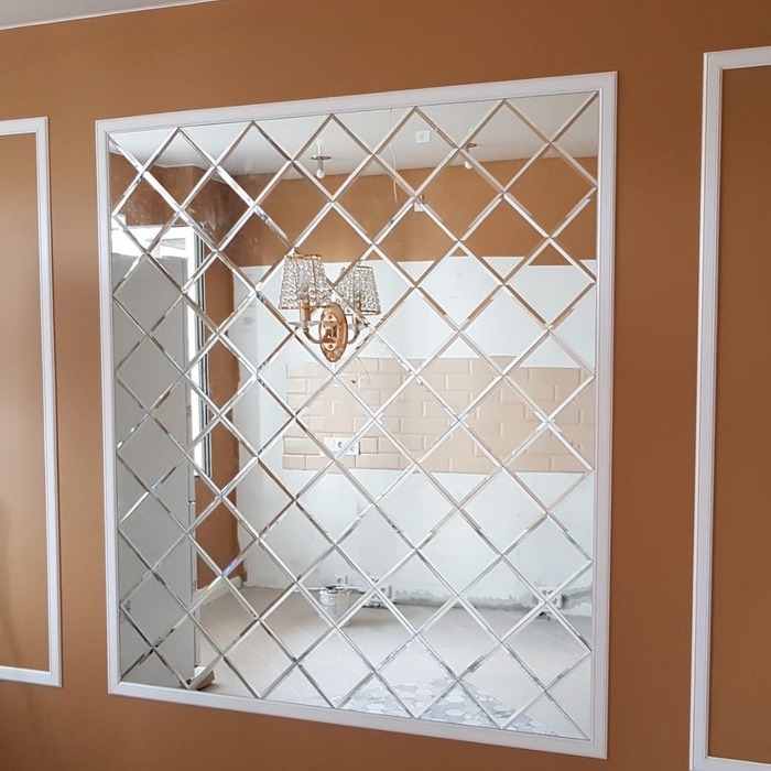 Использована зеркальная квадратная и треугольная плитка с фацетом.