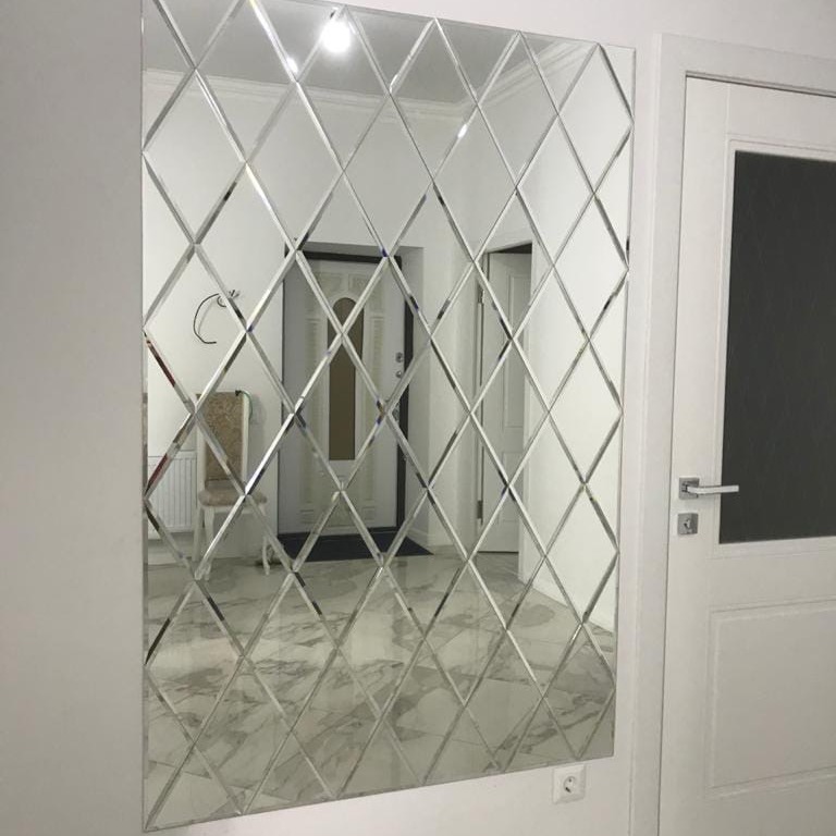 Использовалась серебристая зеркальная плитка формы "вытянутый ромб".