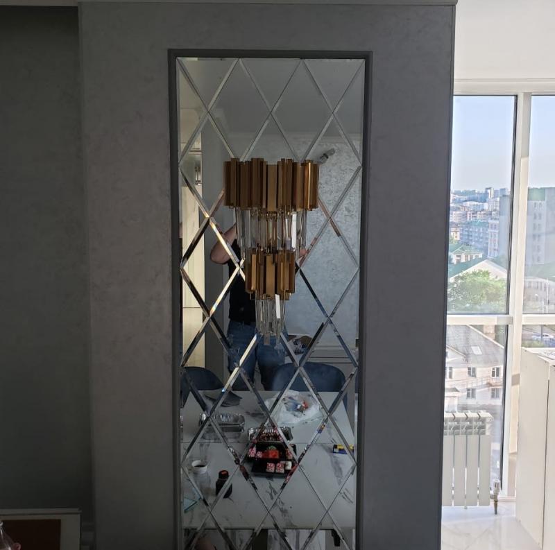 Зеркально панно было сделано из зеркальной плитки 30х30 см, размер панно 255х255 см